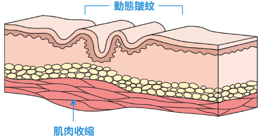 我們誇張的面部表情,如瞪眼、大笑、眉頭緊皺,如果長時間重複出現,令該位置肌肉頻繁地受擠壓,久而久之造成膠原斷裂,形成一道道深深的動態紋,當中包括魚尾紋、眉心紋、抬頭紋、法令紋等。