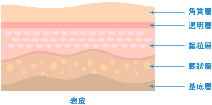 角質層、透明層、顆粒層、棘狀層、基底層